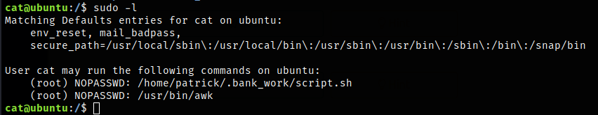 Ahora para escalar los privilegios podemos hacer uso de sudo -l para ver los ficheros que tiene permisos de ejecución sudo desde el usuario cat.